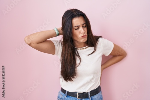 Young brunette woman standing over pink background suffering of neck ache injury, touching neck with hand, muscular pain