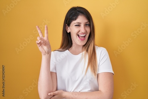 Young brunette woman standing over yellow background smiling with happy face winking at the camera doing victory sign. number two.