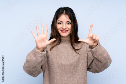 Young brunette woman wearing a sweater over isolated blue background counting seven with fingers
