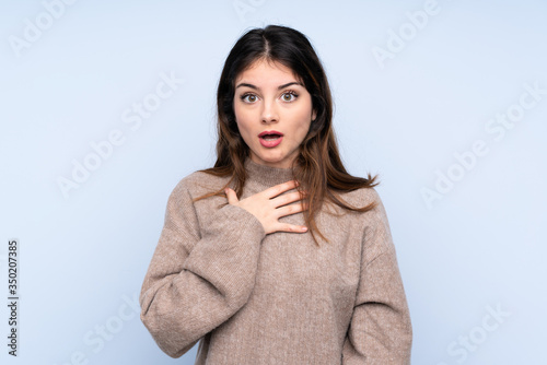 Young brunette woman wearing a sweater over isolated blue background surprised and shocked while looking right