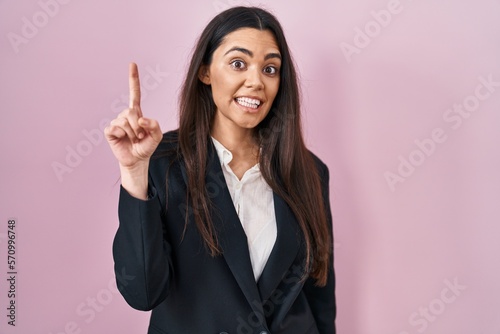 Young brunette woman wearing business style over pink background pointing finger up with successful idea. exited and happy. number one.