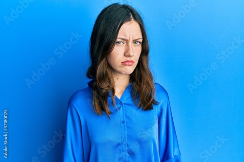 Young brunette woman wearing casual blue shirt skeptic and nervous, frowning upset because of problem. negative person.