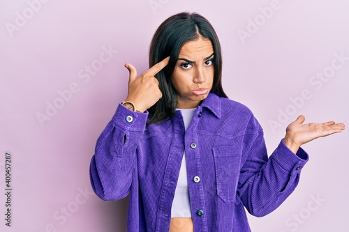 Young brunette woman wearing casual clothes confused and annoyed with open palm showing copy space and pointing finger to forehead. think about it.