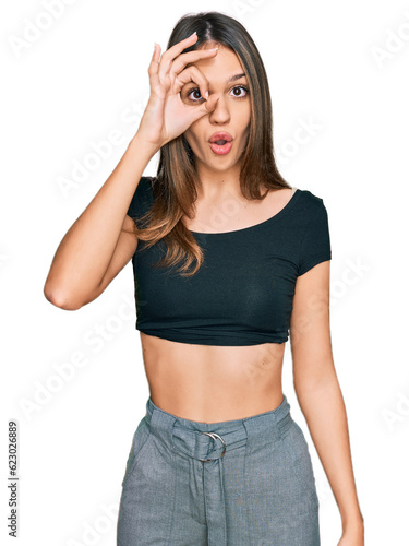 Young brunette woman wearing casual clothes doing ok gesture shocked with surprised face, eye looking through fingers. unbelieving expression.