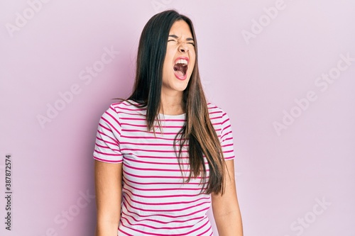 Young brunette woman wearing casual clothes over pink background angry and mad screaming frustrated and furious, shouting with anger. rage and aggressive concept.