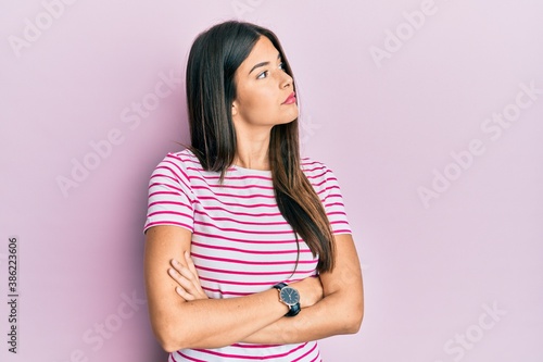 Young brunette woman wearing casual clothes over pink background looking to the side with arms crossed convinced and confident
