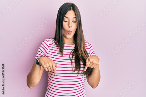 Young brunette woman wearing casual clothes over pink background pointing down with fingers showing advertisement, surprised face and open mouth