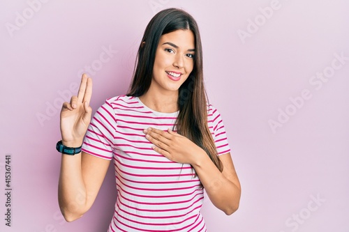 Young brunette woman wearing casual clothes over pink background smiling swearing with hand on chest and fingers up, making a loyalty promise oath