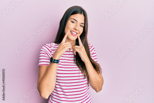 Young brunette woman wearing casual clothes over pink background smiling with open mouth, fingers pointing and forcing cheerful smile