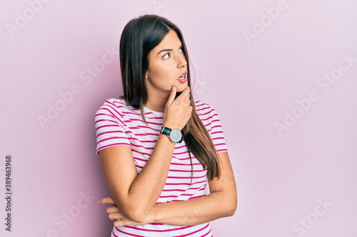 Young brunette woman wearing casual clothes over pink background thinking worried about a question, concerned and nervous with hand on chin