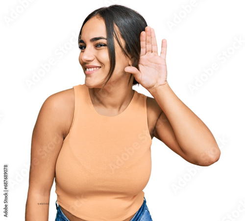 Young brunette woman wearing casual clothes smiling with hand over ear listening an hearing to rumor or gossip. deafness concept.