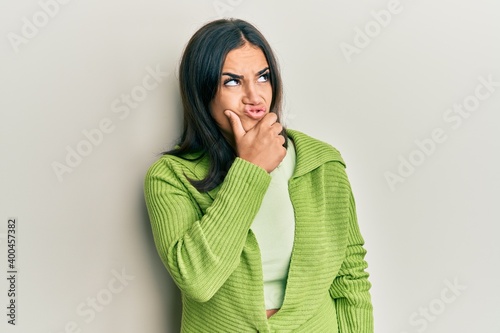 Young brunette woman wearing casual clothes thinking worried about a question, concerned and nervous with hand on chin