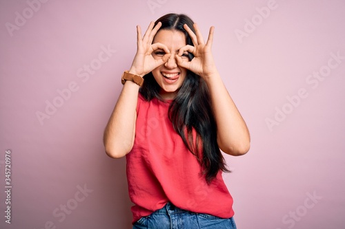Young brunette woman wearing casual summer shirt over pink isolated background doing ok gesture like binoculars sticking tongue out, eyes looking through fingers. Crazy expression.