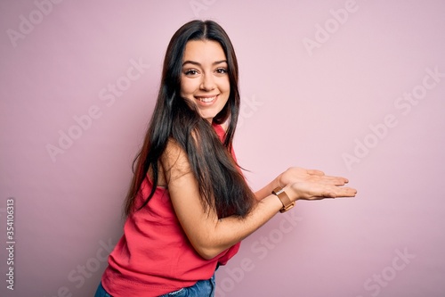 Young brunette woman wearing casual summer shirt over pink isolated background pointing aside with hands open palms showing copy space, presenting advertisement smiling excited happy