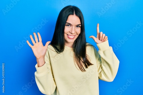 Young brunette woman wearing casual sweatshirt showing and pointing up with fingers number seven while smiling confident and happy.