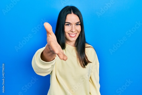 Young brunette woman wearing casual sweatshirt smiling friendly offering handshake as greeting and welcoming. successful business.