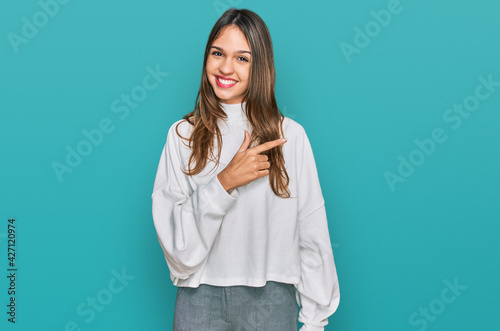 Young brunette woman wearing casual turtleneck sweater cheerful with a smile of face pointing with hand and finger up to the side with happy and natural expression on face