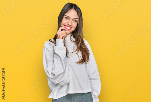 Young brunette woman wearing casual turtleneck sweater looking confident at the camera with smile with crossed arms and hand raised on chin. thinking positive.