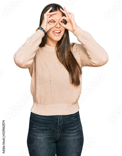 Young brunette woman wearing casual winter sweater doing ok gesture like binoculars sticking tongue out, eyes looking through fingers. crazy expression.