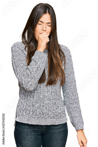 Young brunette woman wearing casual winter sweater feeling unwell and coughing as symptom for cold or bronchitis. health care concept.