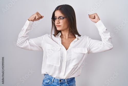 Young brunette woman wearing glasses showing arms muscles smiling proud. fitness concept.
