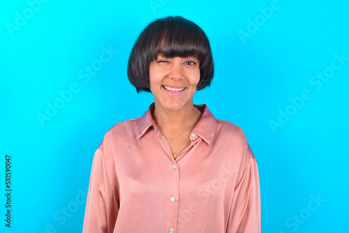 young brunette woman wearing pink silk shirt over blue background blinking eyes with pleasure having happy expression. Facial expressions and people emotions concept.