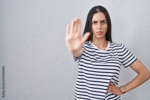 Young brunette woman wearing striped t shirt doing stop sing with palm of the hand. warning expression with negative and serious gesture on the face.