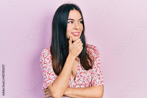Young brunette woman wearing summer dress with hand on chin thinking about question, pensive expression. smiling with thoughtful face. doubt concept.
