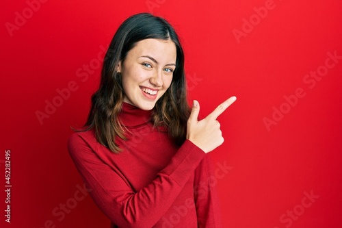 Young brunette woman wearing turtleneck sweater smiling cheerful pointing with hand and finger up to the side