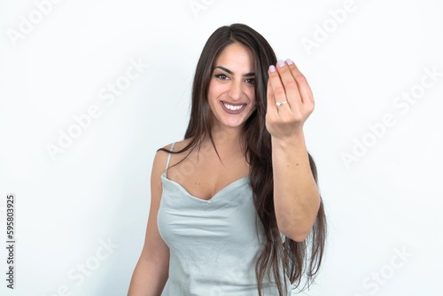 young brunette woman wearing white tank top over white studio background Doing Italian gesture with hand and fingers confident expression