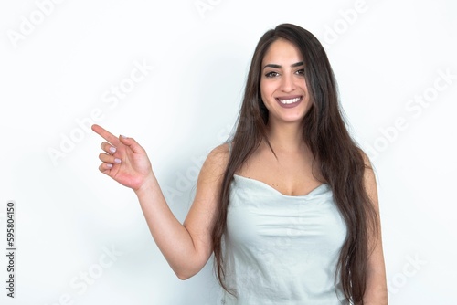 young brunette woman wearing white tank top over white studio background points to side on blank space demonstrates advertisement. People and promotion concept