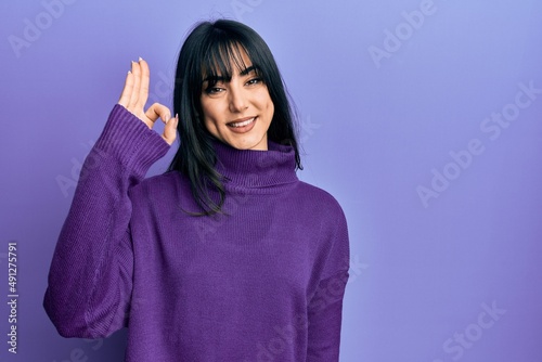 Young brunette woman with bangs wearing turtleneck sweater smiling positive doing ok sign with hand and fingers. successful expression.