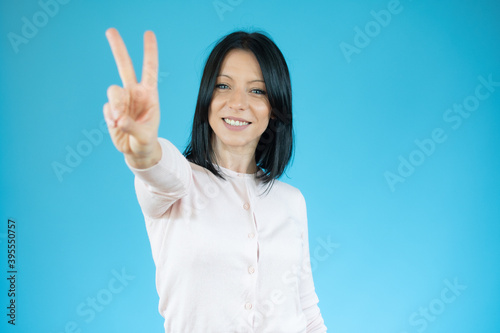 Young brunette woman with blue eyes wearing casual sweater over isolated blue background smiling looking to the camera showing fingers doing victory sign. Number two.