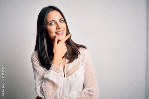 Young brunette woman with blue eyes wearing casual t-shirt over isolated white background looking confident at the camera smiling with crossed arms and hand raised on chin. Thinking positive.