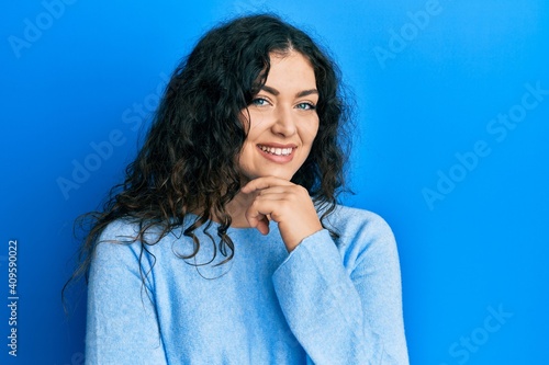 Young brunette woman with curly hair wearing casual clothes looking confident at the camera smiling with crossed arms and hand raised on chin. thinking positive.