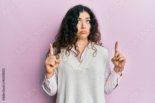 Young brunette woman with curly hair wearing casual clothes pointing up looking sad and upset, indicating direction with fingers, unhappy and depressed.