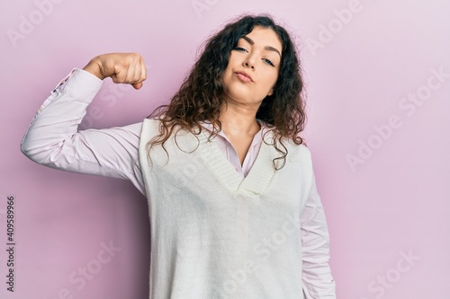 Young brunette woman with curly hair wearing casual clothes strong person showing arm muscle, confident and proud of power