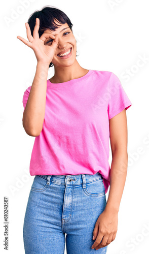 Young brunette woman with short hair wearing casual clothes doing ok gesture with hand smiling, eye looking through fingers with happy face.