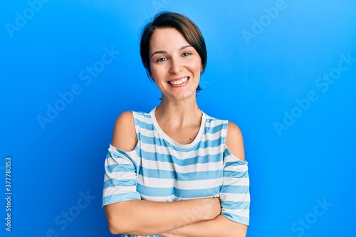 Young brunette woman with short hair wearing casual striped t-shirt happy face smiling with crossed arms looking at the camera. positive person.