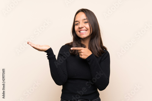 Young brunette woman with white sweater over isolated background holding copyspace imaginary on the palm to insert an ad