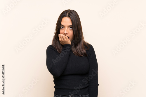 Young brunette woman with white sweater over isolated background surprised and shocked while looking right