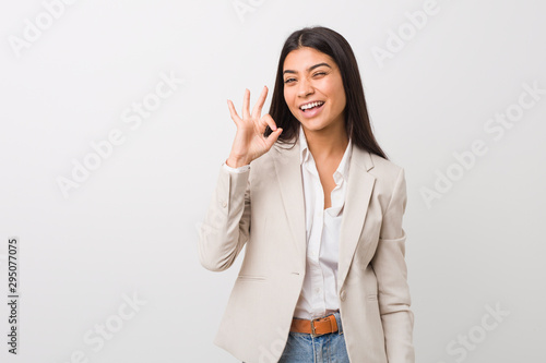 Young business arab woman isolated against a white background winks an eye and holds an okay gesture with hand.