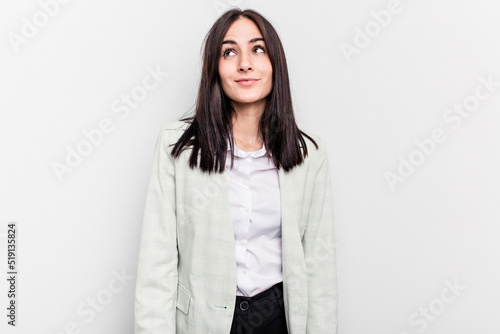 Young business caucasian woman isolated on white background dreaming of achieving goals and purposes