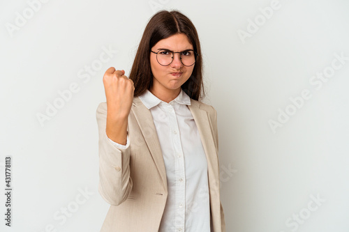 Young business caucasian woman isolated on white background showing fist to camera, aggressive facial expression.