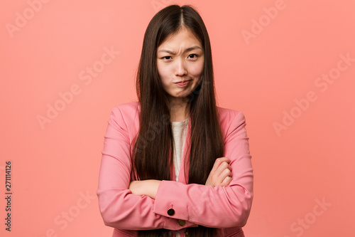 Young business chinese woman wearing pink suit frowning face in displeasure, keeps arms folded.
