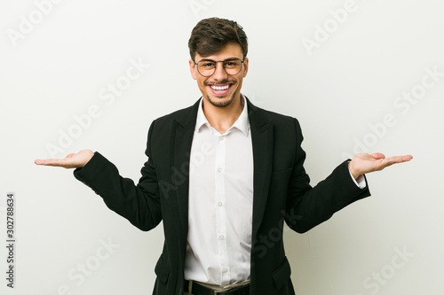 Young business hispanic man makes scale with arms, feels happy and confident.
