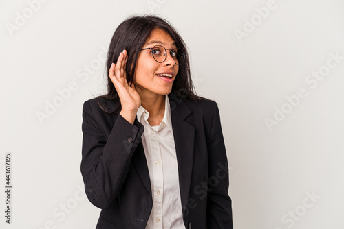 Young business latin woman isolated on white background trying to listening a gossip.