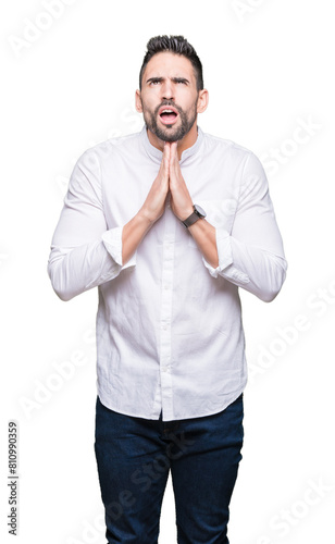 Young business man over isolated background begging and praying with hands together with hope expression on face very emotional and worried. Asking for forgiveness. Religion concept.