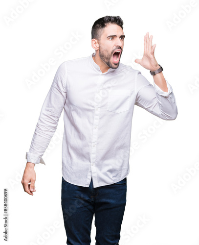 Young business man over isolated background shouting and screaming loud to side with hand on mouth. Communication concept.