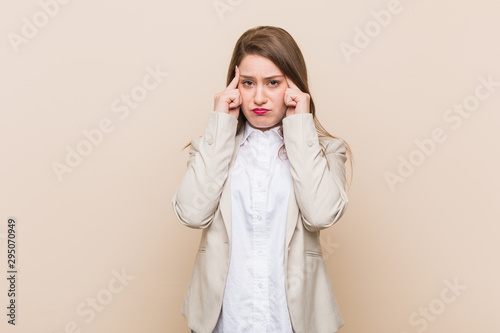 Young business woman focused on a task, keeping forefingers pointing head.